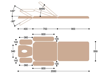 Отличие этой модели массажного стола от базовой - FM2, наличие двухсекционного ложа, с регулировкой "спинной" секции в положение "сидя".
